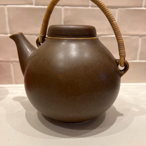 Vakker blå tekanne med flettet stråhank fra Uppsala Ekeby, Gefle.