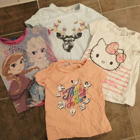 Pakke med tskjorter i størrelse 98/104. Fint brukt, men noe flekker forekommer, se bilder. Selges samlet.