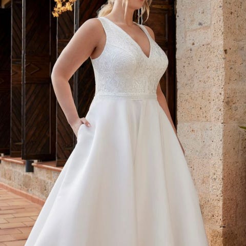 Selger min nydelige brudekjole fra Randy Fenoli. 2024-kolleksjon. Kjolen heter Faye. Str 40. Jeg har kun lagt den opp og sydd på stropper. Stroppene kan enkelt sprettes opp og fjernes. Glidelås i rygg som er skjult av slepet. Høy splitt som kan delvis lukkes med en knapp på skjørtet. Jeg er 172 cm høy og brukte flate sko. Da gikk kjolen til rett over skotuppene.
