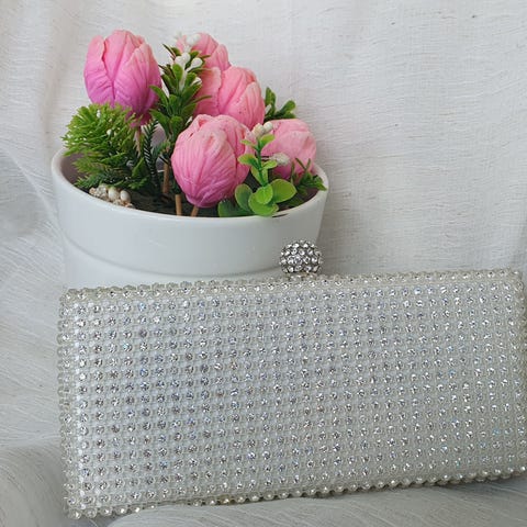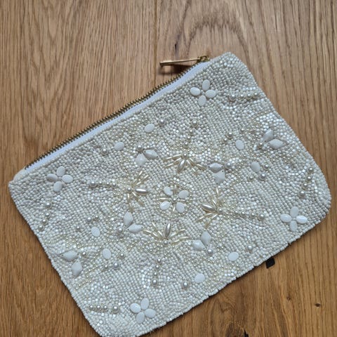Veske/ clutch med perler og «diamanter» som kan brukes til fest/ bryllup/ brudekjole/ selskap.