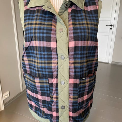 Lekker vendbar vest fra Lee med lommer. Litt usikker på størrelsen men passer som en vanlig L størrelse.