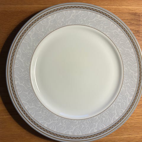 Brukt, svak slitasje på gullkanten og bruksriper i serveringsflaten.