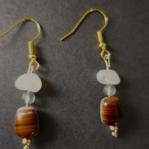 Dekorative brun- og beige fargede øredobber til salgs for 100 kr.