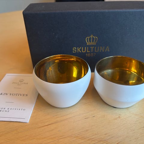 Den var kjøpt for et par år siden brukt få ganger og ellers stått inne i et skap. Trenges å pusses for å få de skinnende igjen.