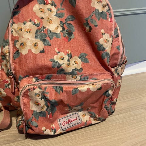 Pent brukt Cath Kidston ryggsekk med et stort hovedrom, pc-lomme og liten lomme fremme, i svart, grå og hvit blomstrete mønster.