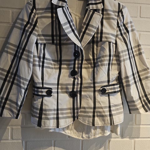 Pen jakke i bomullsstoff med polyester innerfor. Farge: blå og hvit, rutemønster, kort modell, merke: Brandtex. (Se gjerne mine andre annonser også)