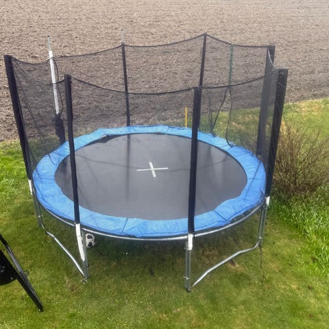 Komplett trampoline på 3,6 meter diameter med kraftige føtter. Noen år gammel med komplett og i god stand med alle fjører etc. Er pr tiden oppmontert og kan demonteres på en halvtime. Må hentes, eller at den kan demonteres, fraktes i Trondheimsområdet og monteres om ønskelig mot betaling.