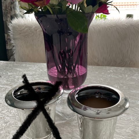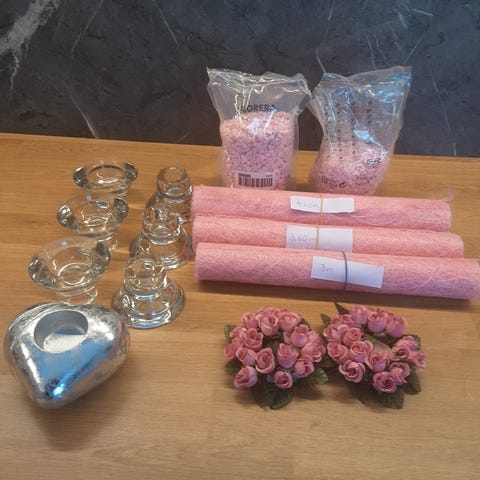 Har ett nytt sett med dåds pynt til jente har nare blitt liggende. Følger med telys, vase , lys og sløyfer (bånd)