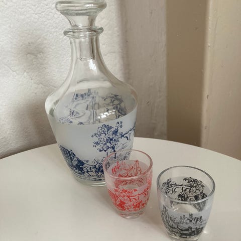 Samling av karafler, glassflasker, lommelerke, alle vintage