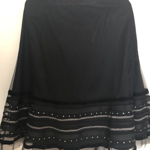 Selger et pent brukt sort skjørt med skimmer i stoffet. Skjørtet ser fint og elegant ut. Selges da det dessverre har blitt for stort. Str 40.