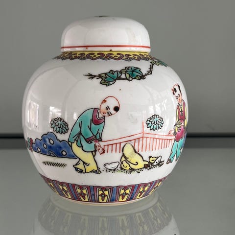 Vakker kinesisk krukke fra ca 1960. Div slitasje i glasuren.