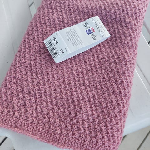 Hjemmestrikket babyteppe i rosa med hvit kant til vogn. Nå kr. 100,-
