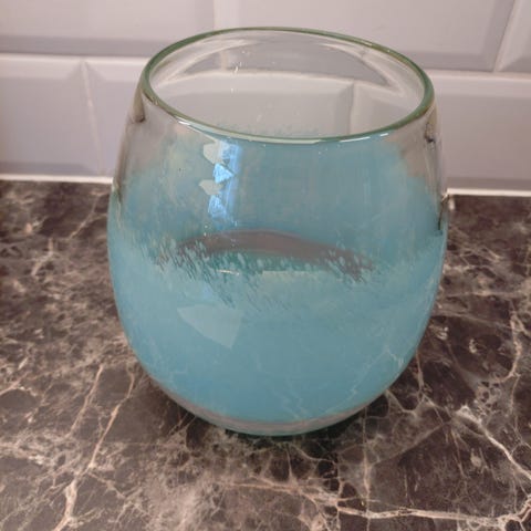 Stor vase formet som et conjakkglass. Har sett lignende blitt brukt til Conjakkuler i gamle kiosker. Diameter øverst er ca 15cm og høyde ca 24cm. Ingen skader. Noen bobler i glasset her og der .Kan hentes i Stokke i Vestfold eller sendes mot porto.