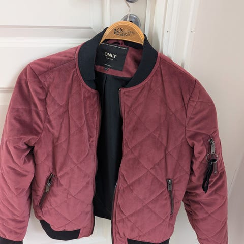 Kjempekul burgunder bomberjakke. Jakken kan vrenges, slik at man har to ulike jakker i én. Mener den er størrelse medium, men vil nok også passe fint til small.