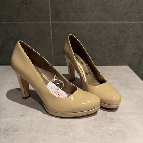 Pumps i farge champagne/ beige. De er ubrukt og blitt oppbevart i skap i leilighet. På innsiden av den høyre skoen har det blitt noen flekker fra en annen sko, men syns ikke godt. De er i str 39 og har kostet 799 ved kjøp, selges for 150kr