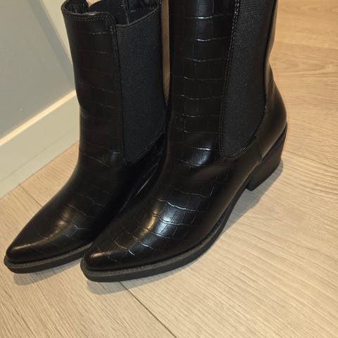 Støvletter i mykt lær, pent brukt. Pene til skjørt, smal i skaftet, passer til smale legger. Gode å gå i (myk gummisåle). Hælhøyde 4cm.
