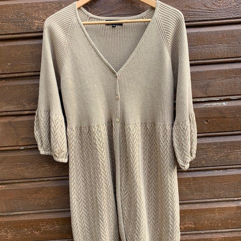 Tilstand . Tunika /kjolen er ikke brukt. Er kneppet fremme og har splitt I sidene. Kan brukes til mye. Som tunika, kjole, utenpå en kjole, skjørt m.m .Stilig!
