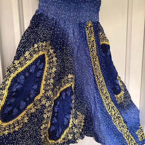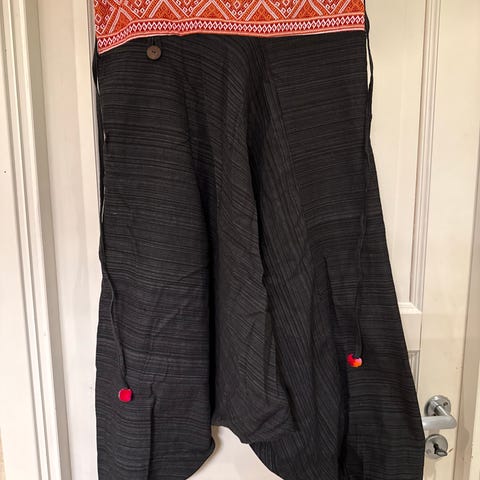 Kjøpt i Tunisia. Lengde fra livet og ned ca. 90 cm. Livvidde når strikken strekkes ca. 84 cm. Når den ikke strekkes ca. 64 cm.