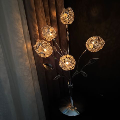 Flott vintage bordlampe som er gullbelagt med steinbase. Lampen kommer også med en rød skjerm. Usikker på alder men har nok noen år bak seg.