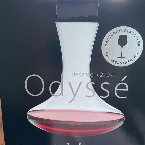 Dekanter fra Odysse og Hadeland Glassverk som rommer 210 cl. Dekanteren er utformet for å få frem det beste i vinen, lufte den på riktig måte og forbedre vinens kvaliteter. Å servere vin i dekanter gir en helt spesiell følelse, i tillegg ser den lekker ut på et dekket bord.