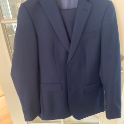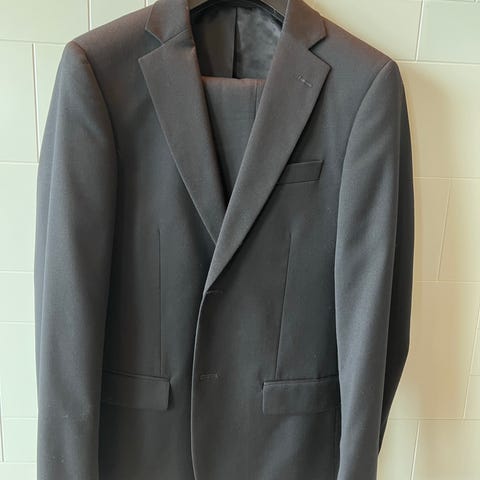 Grå, lekker dress i ullstretch med nydelige detaljer fra Dressmann. Brukt til jul og konfirmasjon. Fremstår som ubrukt og ny. Stoffet er av ull, lycra og polyester.