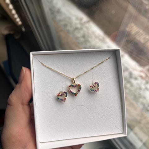 Vurderes solgt. Nydelig anheng med øredobber i sølv som ser ut som roségull. Kløverform. Lilla innfattede steiner.