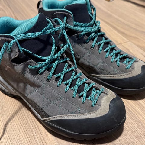 La sportiva fjellsko. Perfekt for turer i fjell og skog. God ankelstøtte og vannavstøtende materiale med en Goretex membran i tuppen. Kun brukt noen få ganger da de dessverre er litt for små. Str 39 1/2. Kjøpt nye for 4400kr.