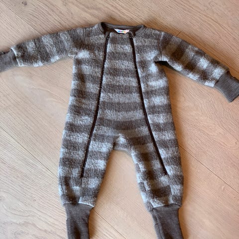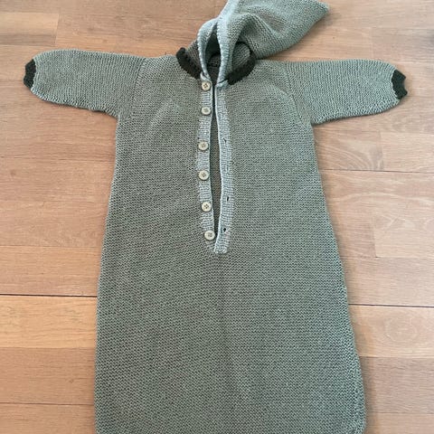 Rakk ikke bruke denne før mini sluttet å sove i barnehagen. Måler 75 cm fra skulder til innbrettet fot og 40 cm fra topp av glidelås til skrittet.