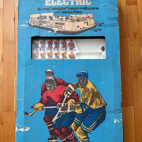 Eldre bordhockey fra IGRA, Tsjekkoslovakia, sannsynligvis produsert en gang på 60tallet. Inneholder 12 spillere, 2 mål og puck. Brettet måler ca 315x565mm, eska måler 335x630mm. Mangler 2 føtter som er enkle å lage evt erstatte med noe annet. Sliten originaleske, mangler en ørliten plastbit som gjør at målet står noe skjevt på ene siden samt et par småmerker i isen foran keeper. Ellers meget bra stand for en samler eller andre entusiaster.