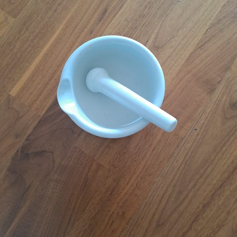 For kr 200,- Den er 8 cm Høy og har en Diameter på ca 9 cm og pinnen / stamperen er 14,5 cm og totalvekten på hele arrangementet er 0,7 kg .