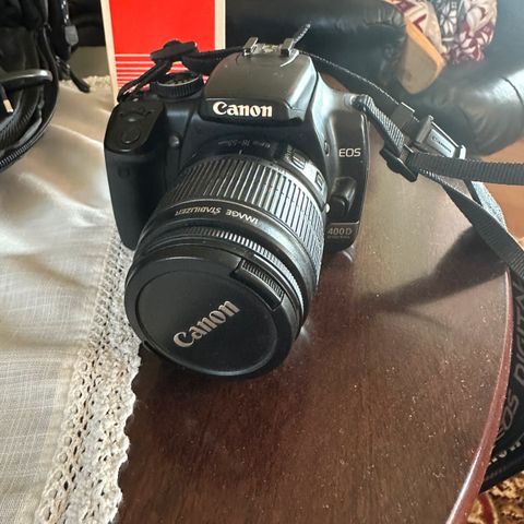 Pent brukt kamera med ekstern blitz, 2 minnekort, Sigma zoomobjektiv 18-200 mm og Lowepro veske