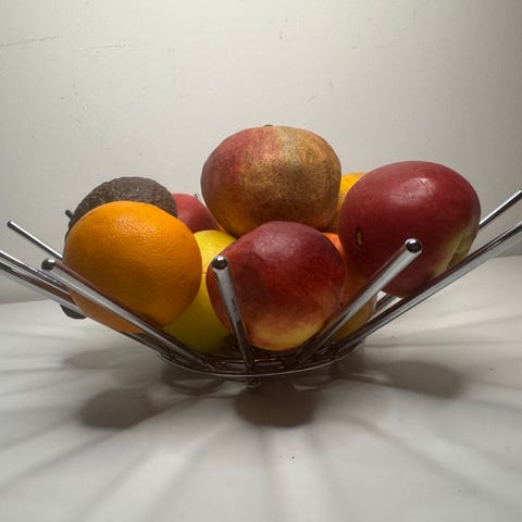 Fruktfat i polert aluminium fra 80 tallet. Høyde ca. 13 cm. Lengde ca. 25 cm.