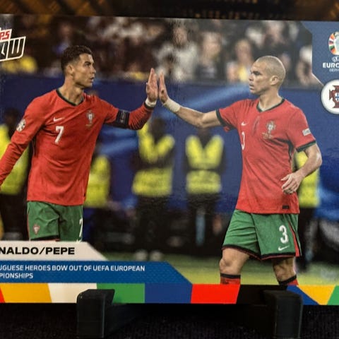 Kortet er fra serien Topps Now, og er en hyllest til de to veteranene Ronaldo (39) og Pepe (41) som sannsynligvis deltok i deres siste EM.