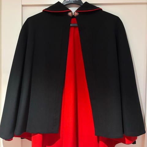 Ny bunadcape svart med rødt for selges, ca 50 cm over skuldrene, 73 cm lengde.