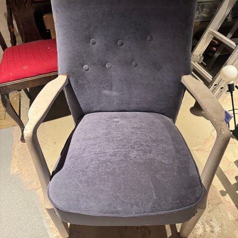 Hel og pen i stoff og treverk. God sittekomfort, myk og god. Den har avtagbart sittepute.