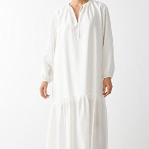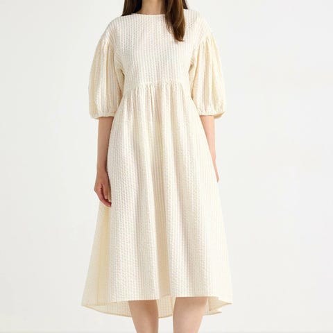 Kjolen er laget av 100% økologisk bomullspoplin. Kjolen kommer med elegant V-utringning foran og skrå lommer på hver side. Ermene har raffinerte smock- og frilldetaljer, som bidrar til å gi volum til ermene. Nederst på ermene er det en liten splittåpning samt nederst på kjolen.