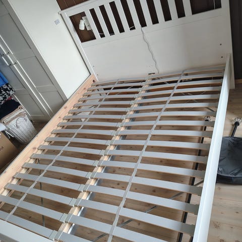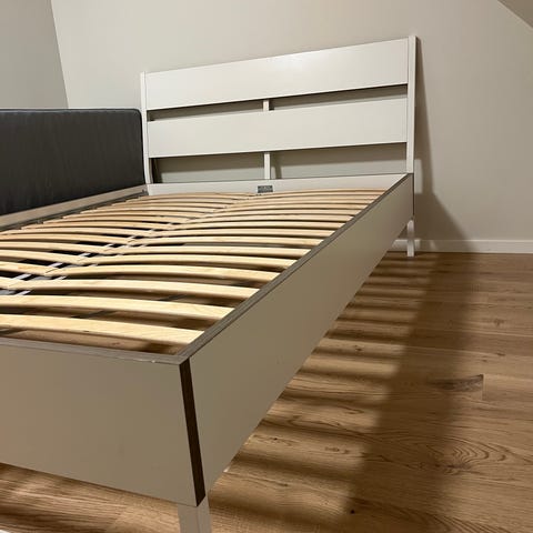 IKEA sengeramme i hvit farge med lamellbunn. Passer for standard madrass og gir støtte og stabilitet for sengen.