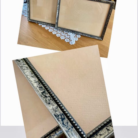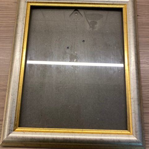 Eldre ramme som aldri har blitt brukt, med bamse og jente.
