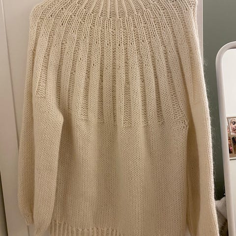 Halvhøy hals valgfri helt opp eller noe brettet, noe ballong-erm, delvis perlestrikk, romslig i størrelsen M/L pga god lengde på ermer og bol, Raglandsfelling