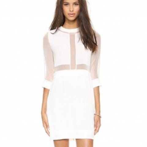 Kjempefin kjole fra Vila i hvitt, med sorte detaljer. Åpen i ryggen, skjult glidelås og knappelukning. Kjolen er bruk 1 gang, og er nå nyvasket og klar for ny eier. Størrelse L/42.