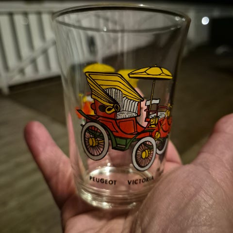 Vintage stilig glass m/veteranbil motiv selges. Noe bruksmerker/slitasje kan forekomme. Selges som det er. Se bilder.