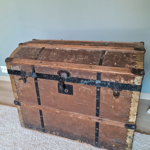 Tøff stor Amerika koffert. Mange flotte detaljer med beslag i jern og nagler. Solid sak i treverk. Egner seg feks til sofabord, en kan sette på små hjul eller føtter om en ønsker. Eller som sidebord/avlastningsbord, se vedlagt inspirasjonsbilde.