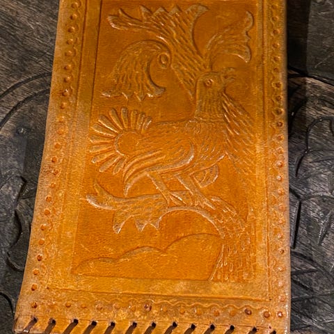 Nydelig lommebok i brunt lær, dekorert med elefanter og blomster.