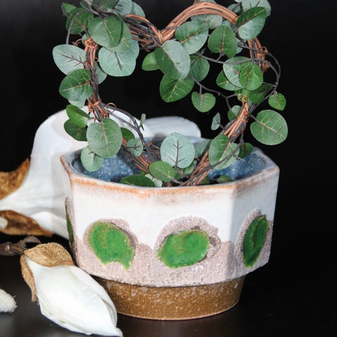 Vakker pyntepotte i keramikk i varme høstlige farger, brunt/gyllent/grønne nyanser.