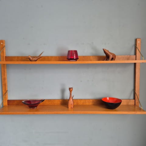 Teak hyller av resirkulert teak med ny produserte bøyler. 80 cm, 70 cm, 65 cm eller 60 cm brede og 20 cm dype. 600,- pr. stk! .