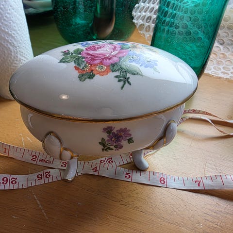 Dette flotte stettfatet i hvitt porselen er nydelig dekorert i ulike nyanser av blått. Det er tungt og stødig, veier nesten 700 g. Diameter ca 19,5 cm, høyde ca 8 cm. Vet ikke hvor det er laget.