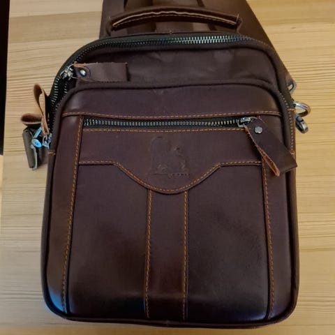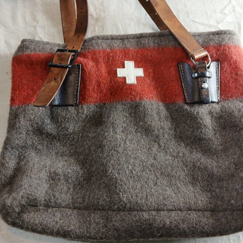 Eksklusiv sveitsisk alpeveske i herrevariant, laget i tykk ull med rødt silkefôr og detaljer i lær. Et stilfullt og sjeldent tilbehør med svært høy kvalitet og håndverksfølelse.