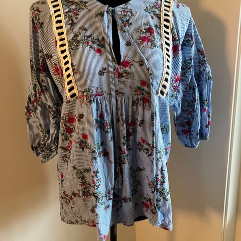 Svart, bluse med blomstermønster i orange/grønt/hvitt. Lange ermer med vide volanger. Broderte border i rødt og blått foran. Flowy og peplum-ish utsvingt med liten volang ved hem. Lenger bak enn foran. V-utringet. 100% viskose.