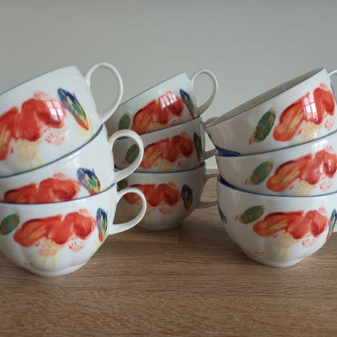 Vakkert servise fra Porsgrunn Porselen . Dekorert med vårblomster og heter " Fiore Spring ". Alle deler er feilfrie. De fleste delene fremstår som nye/ minimale bruksspor.