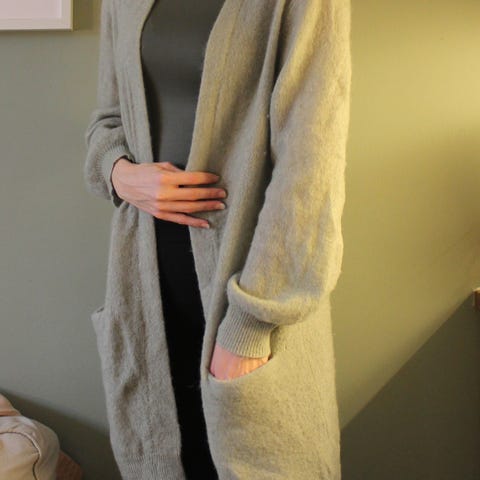 One size. Nydelig cardigan i mohairblanding. Fine, freshe, lune farger. Varm og god. Mohairblanding av baby alpakka, merinoull.